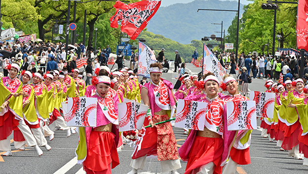 祭りは、パレード(3日の花の総合パレードと5日のきんさいYOSAKOIパレード)、