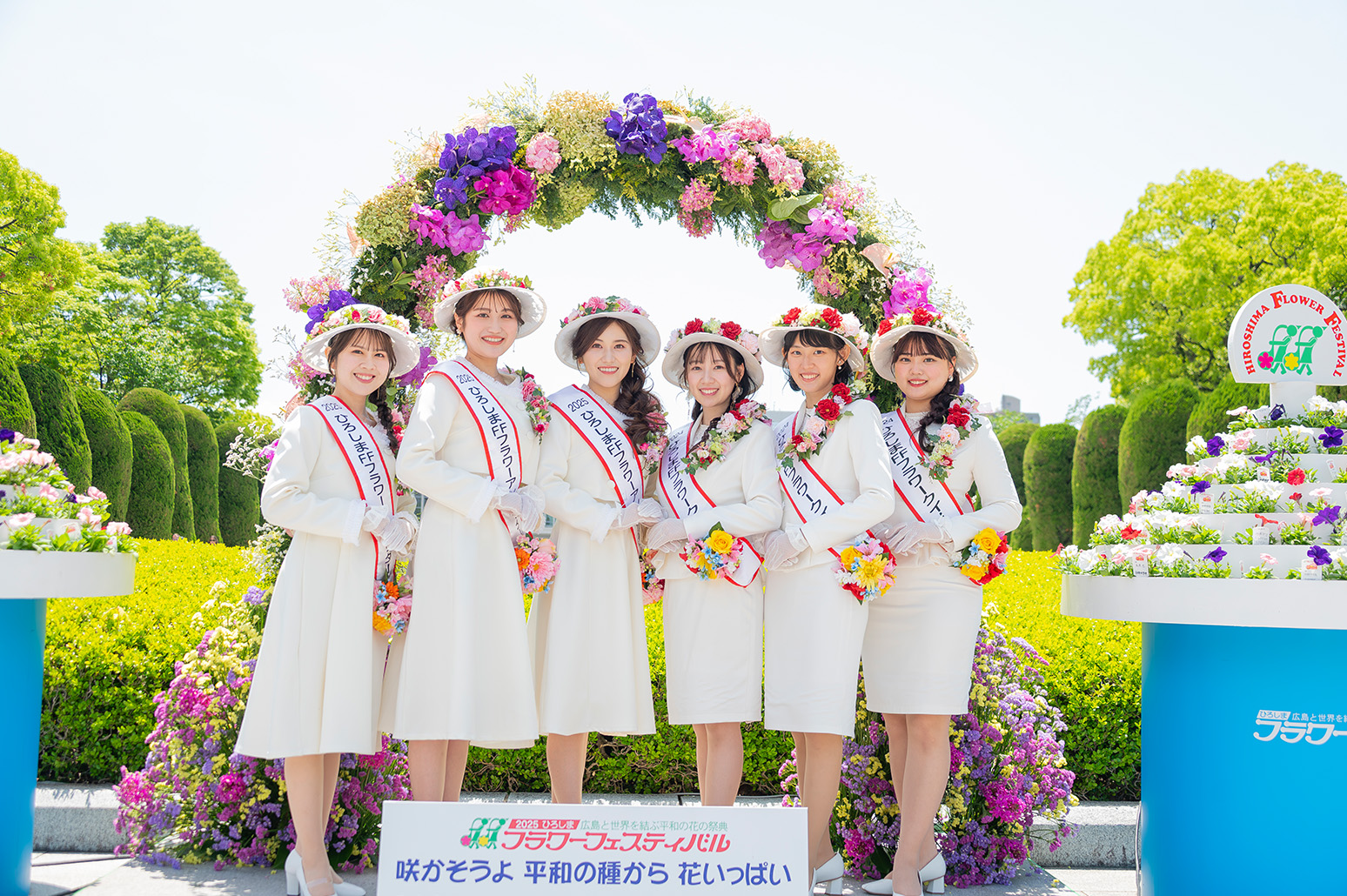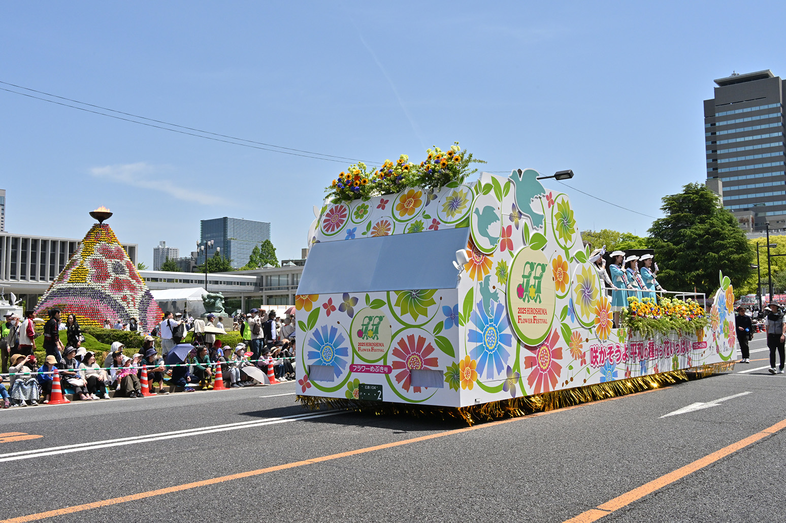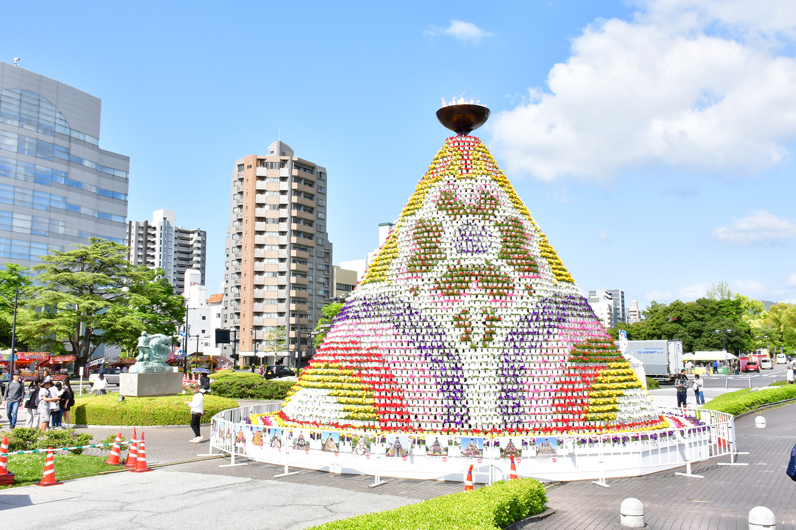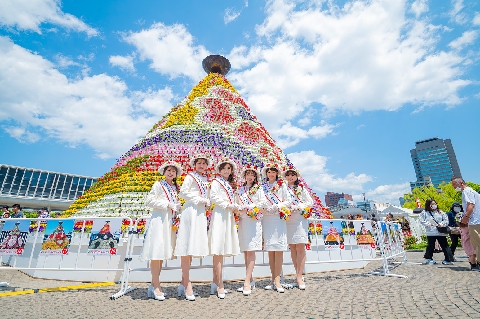 FFのシンボルは「フラワーアンバサダー」「花の塔」。花の塔はカーネーションやペチュニアで飾られた高さ8m直径9mで平和記念公園に設営され、フラワーアンバサダーは祭りに花を添えます。