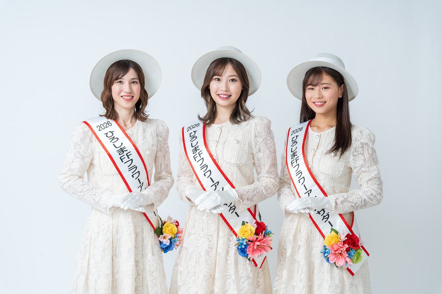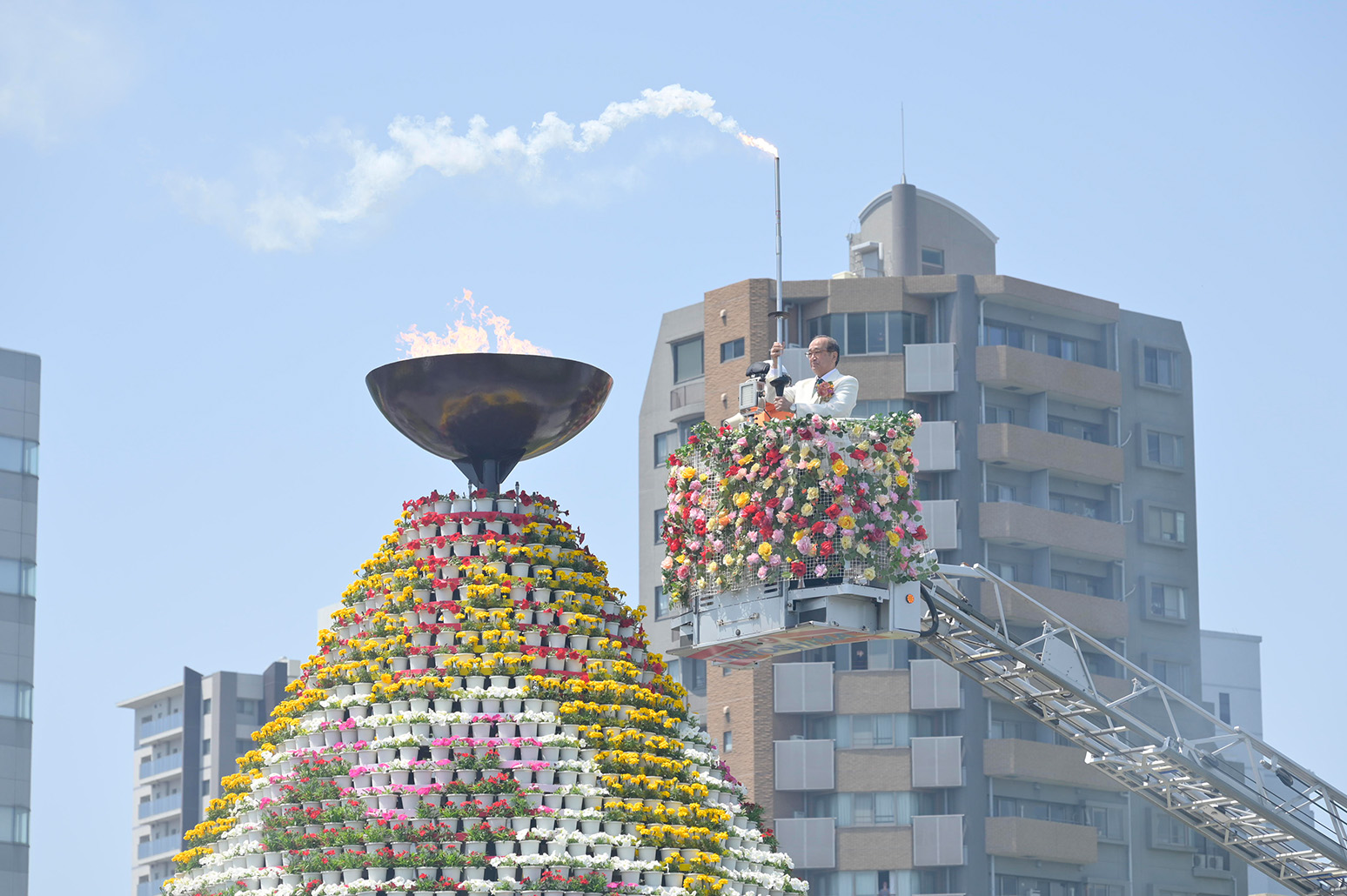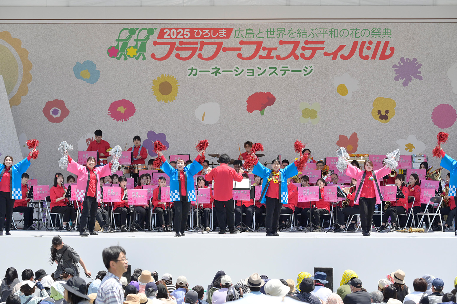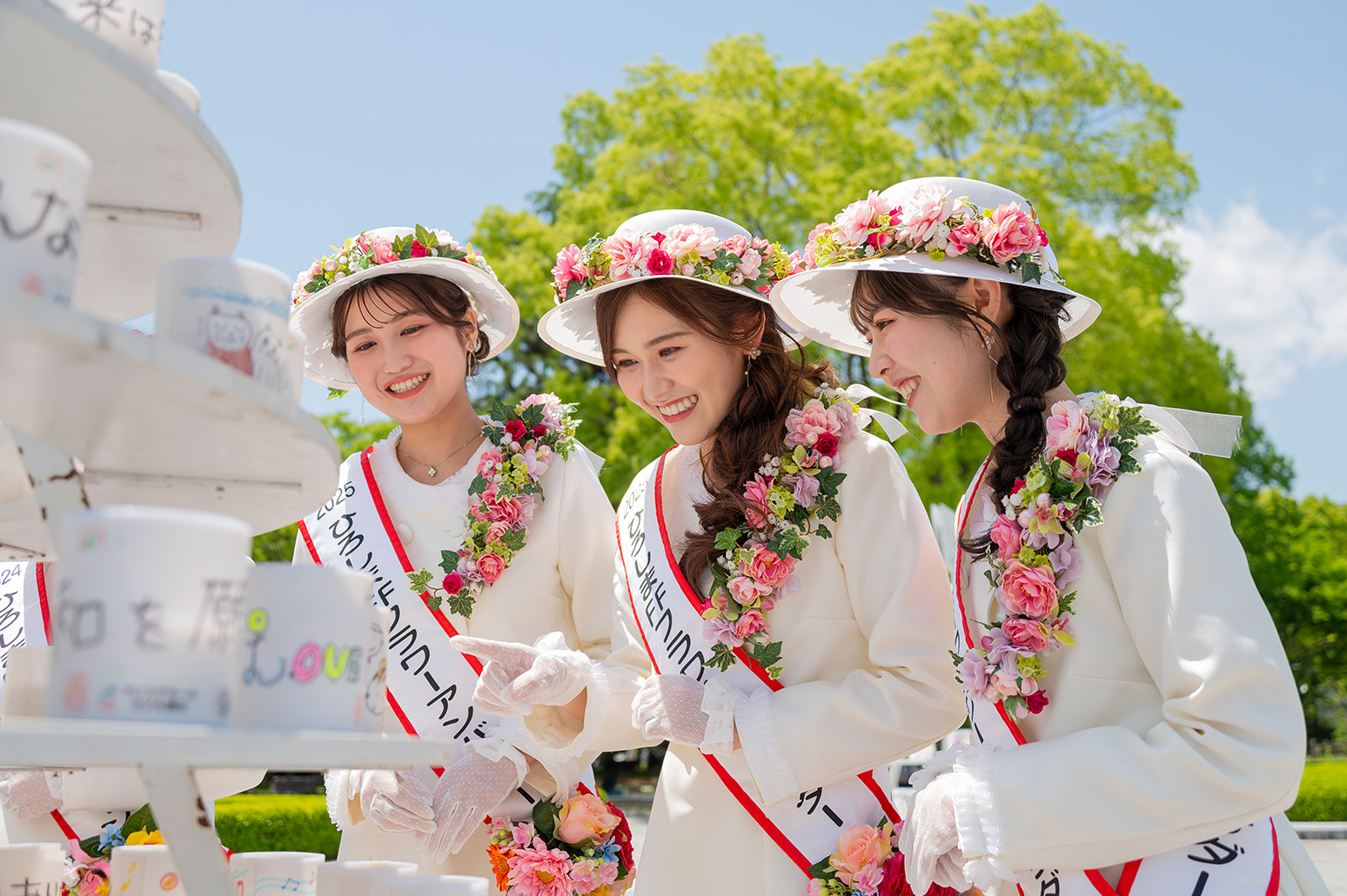 FFのシンボルは「フラワーアンバサダー」「花の塔」。花の塔はカーネーションやペチュニアで飾られた高さ8m直径9mで平和記念公園に設営され、フラワーアンバサダーは祭りに花を添えます。