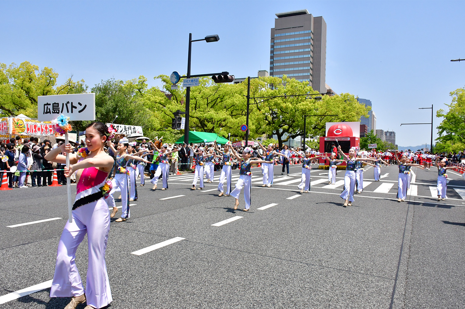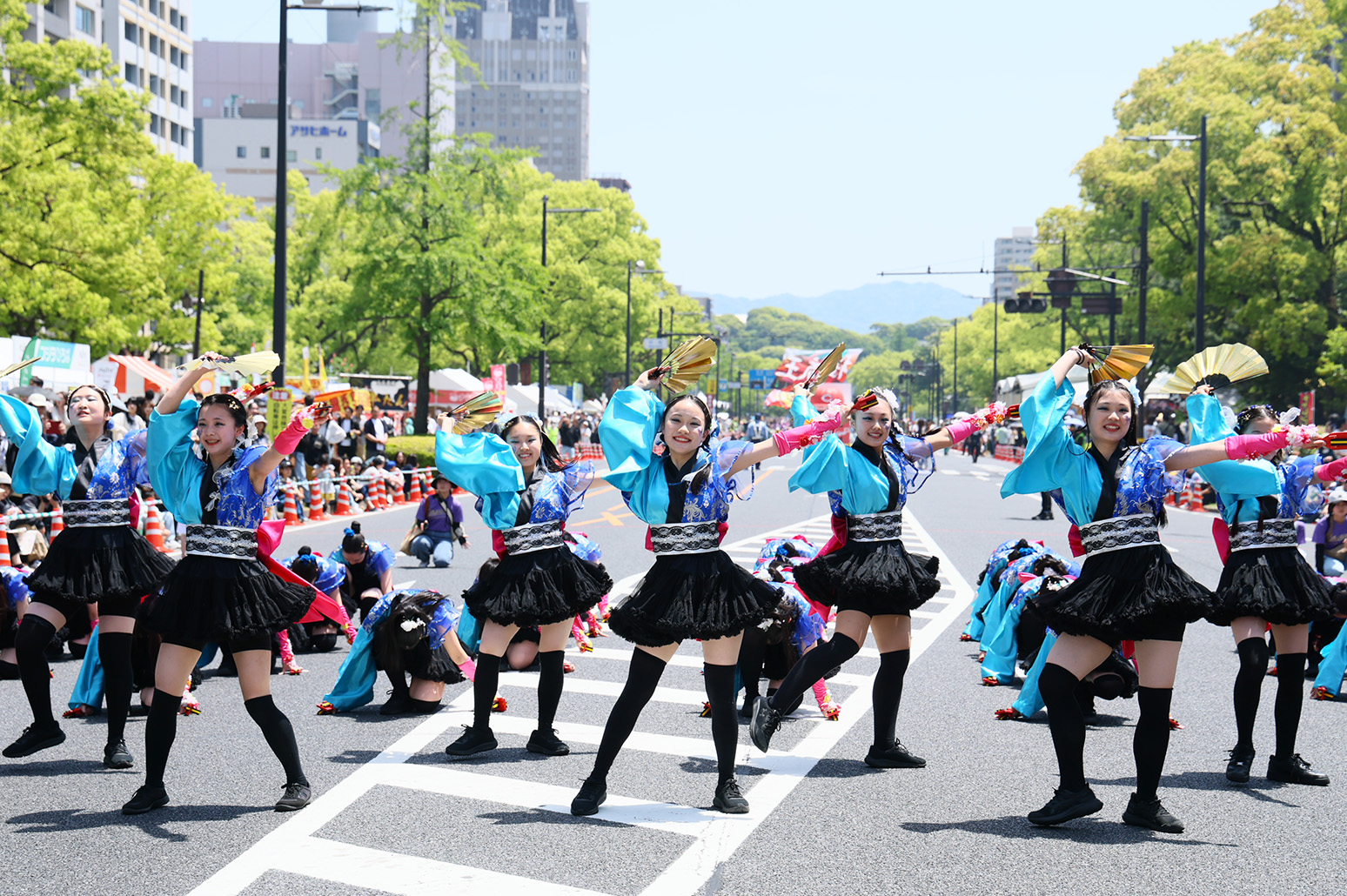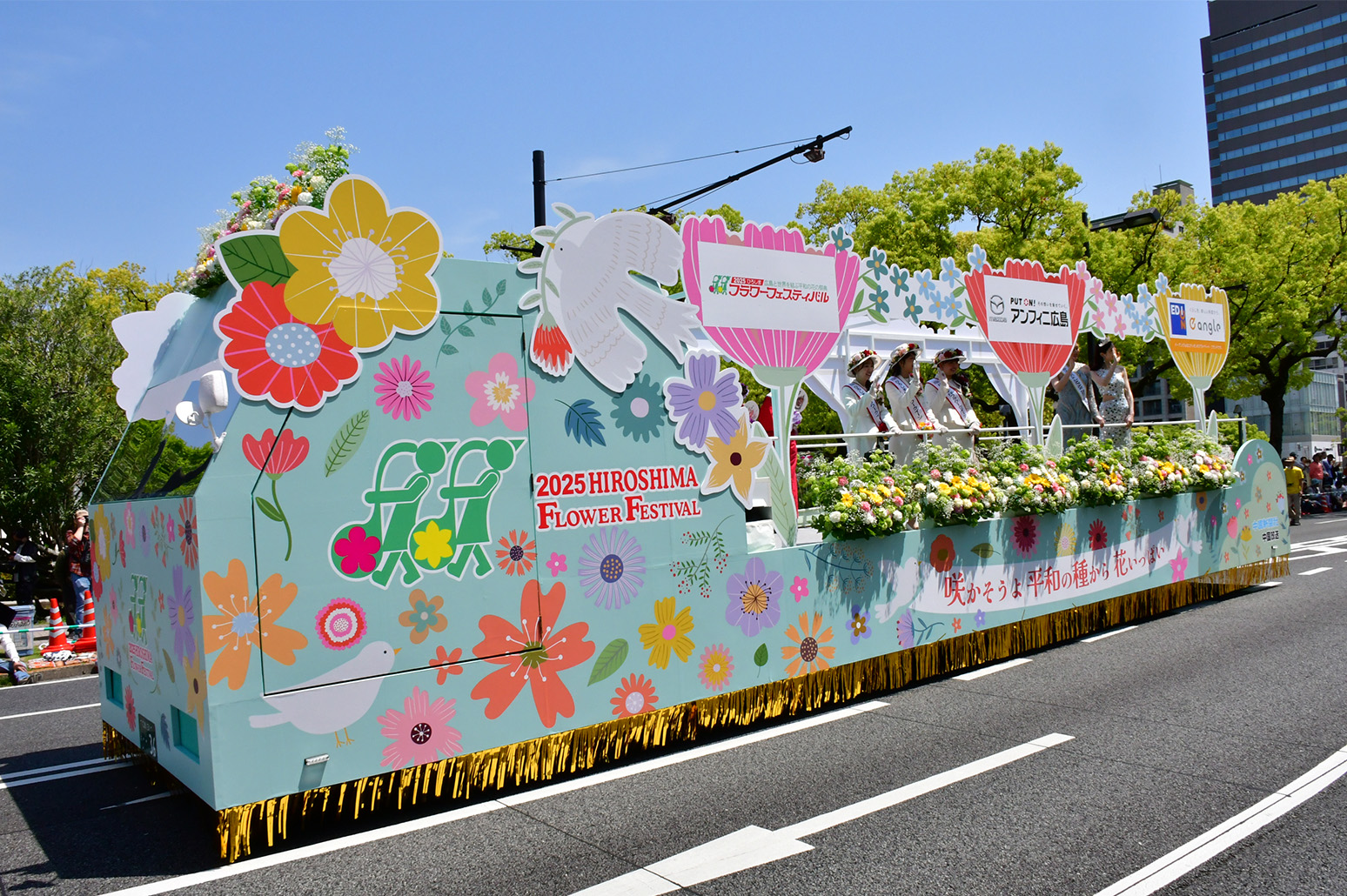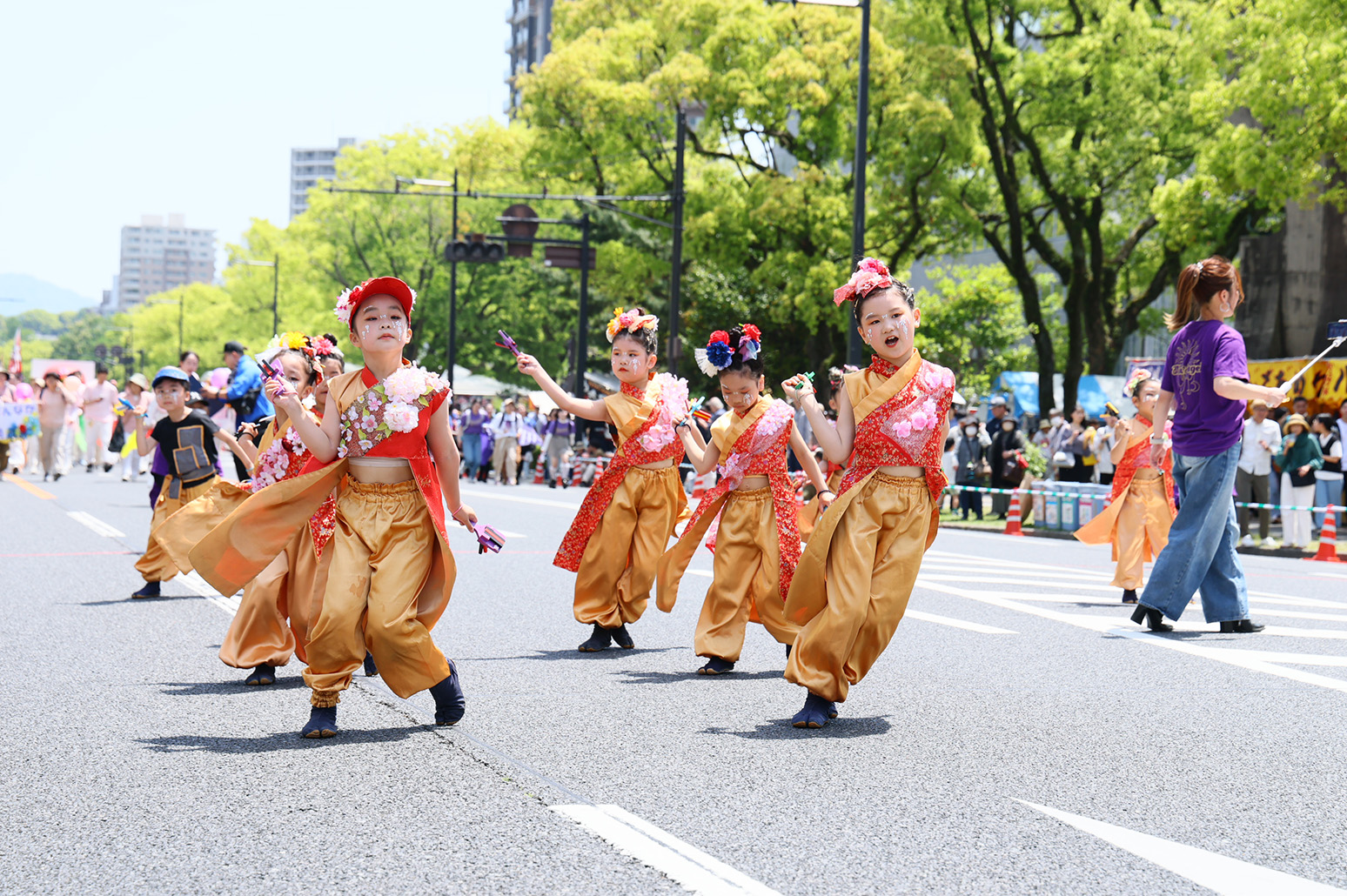 FF初日の5月3日、毎年、90団体6000人を超える参加団体は衣装や演出に花をあしらい、平和大通り約1.2kmをパレードします。