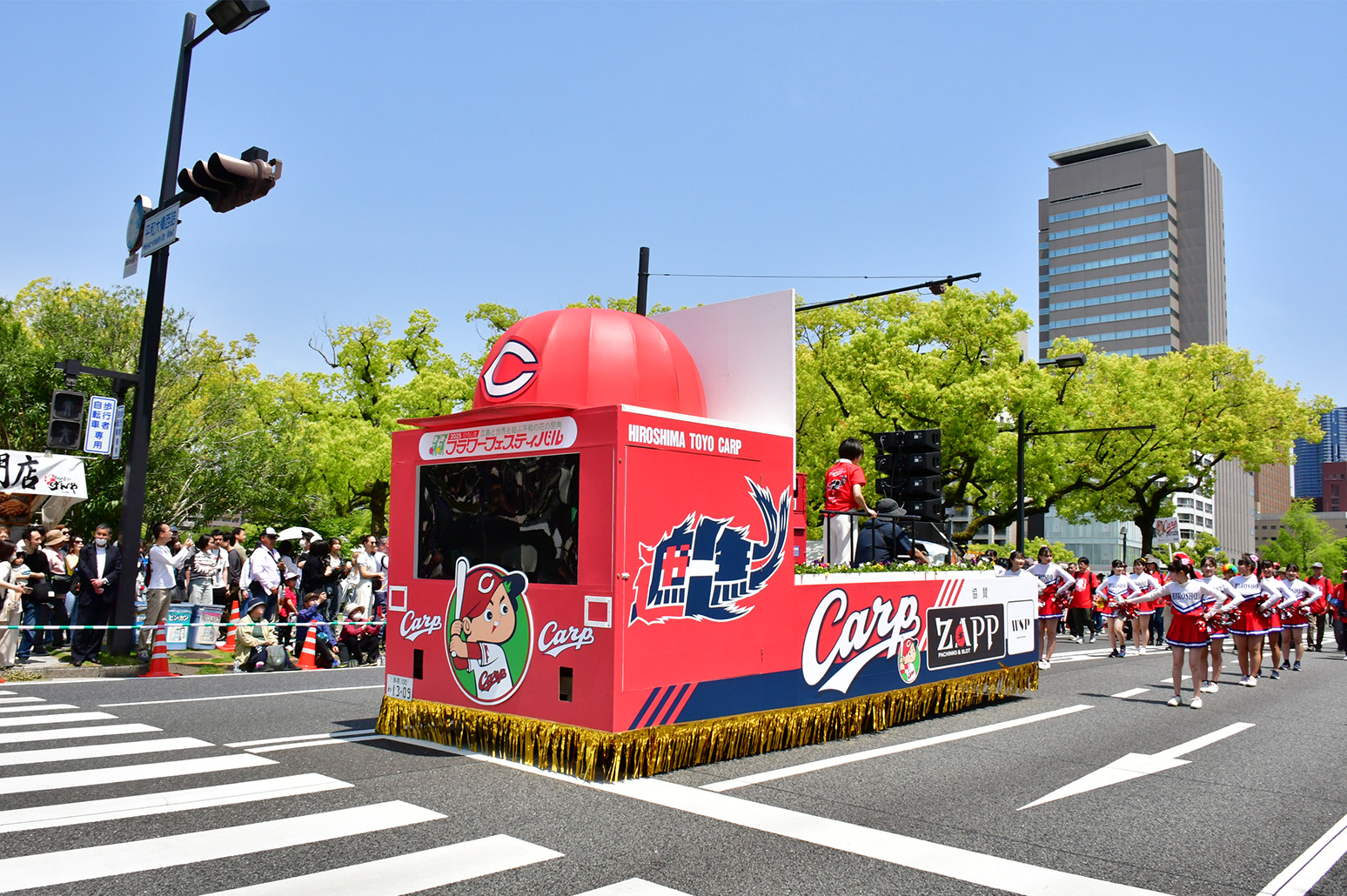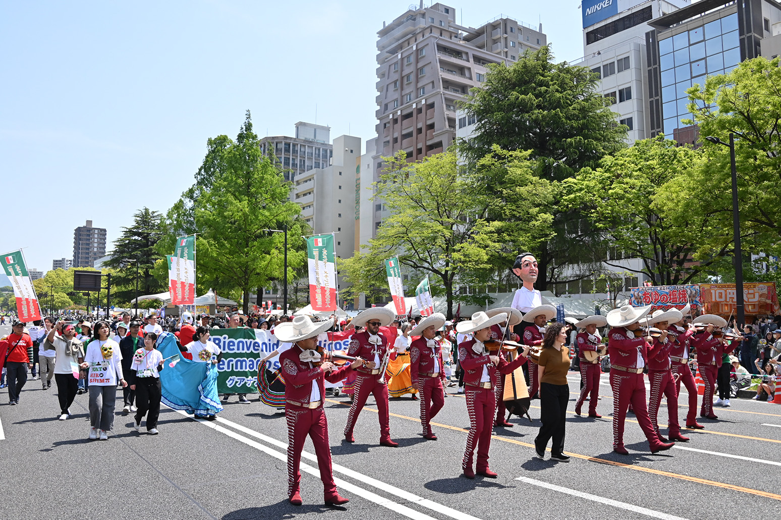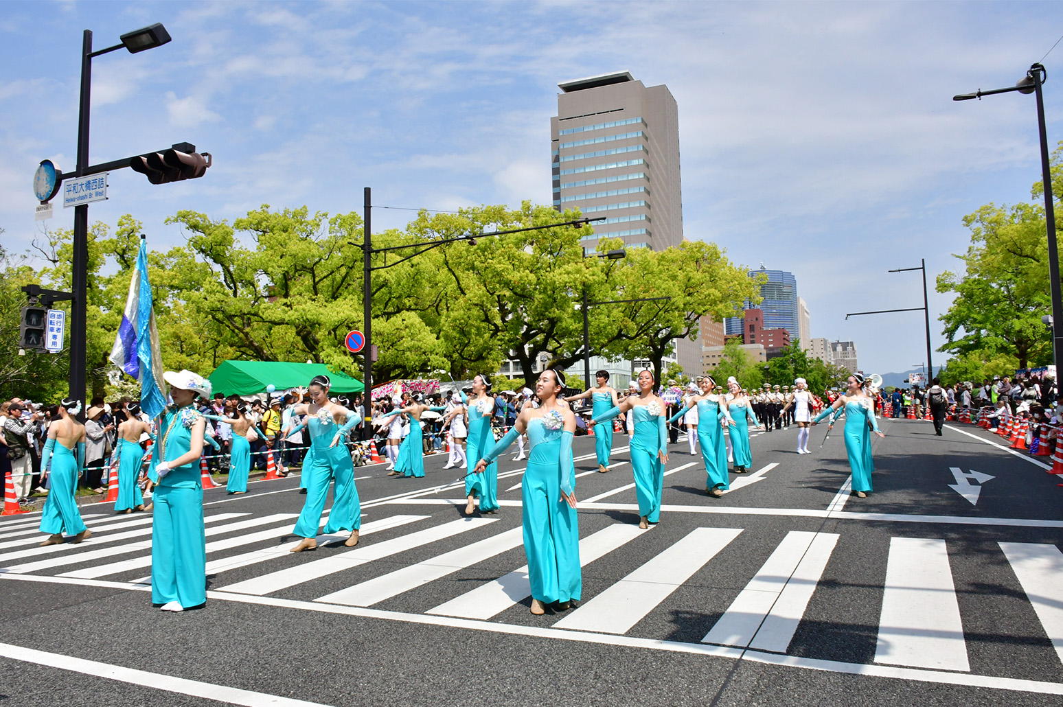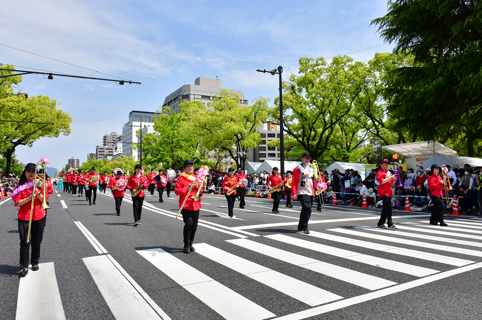 FF初日の5月3日、毎年、90団体6000人を超える参加団体は衣装や演出に花をあしらい、平和大通り約1.2kmをパレードします。
